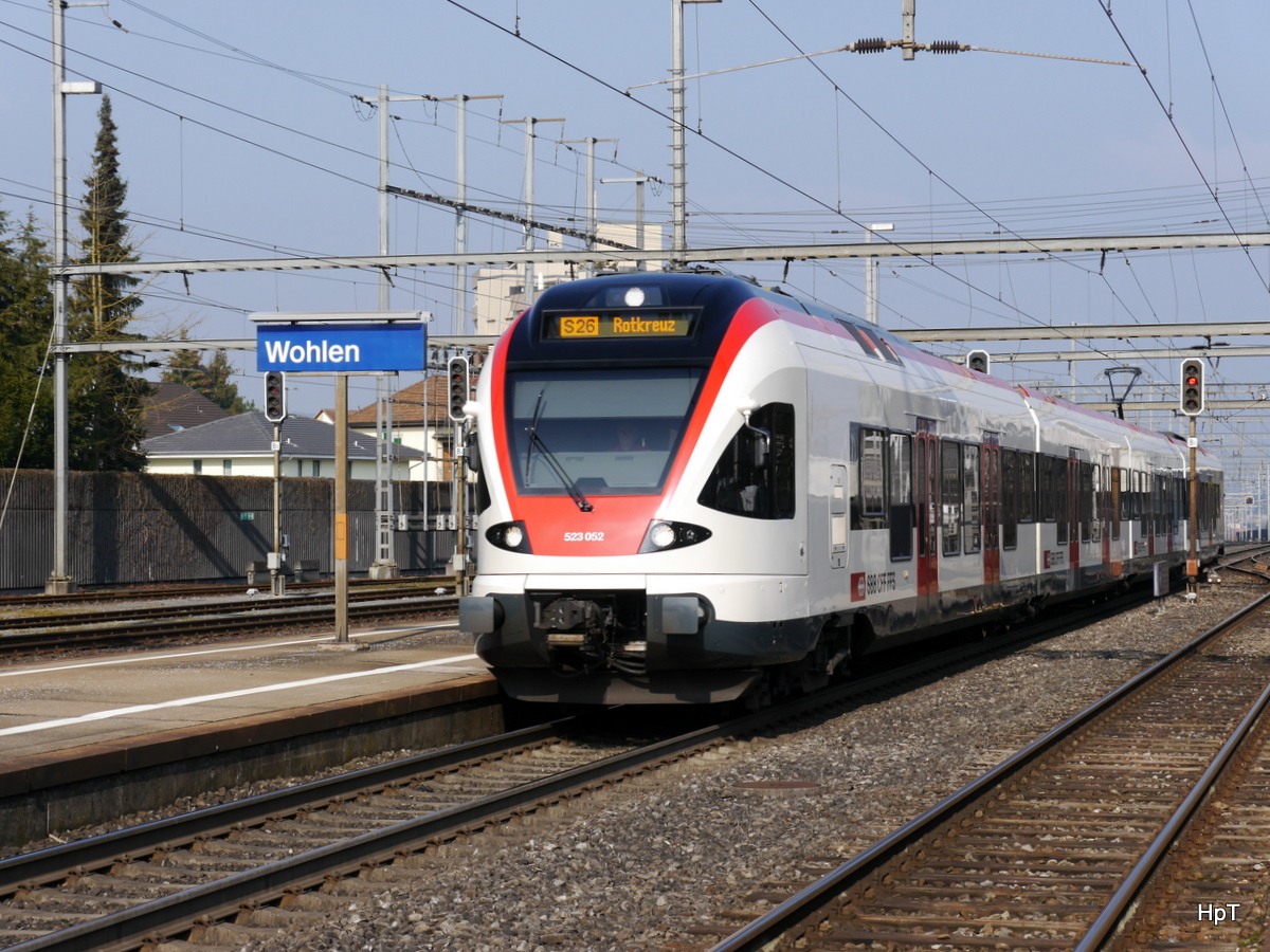 SBB - Triebzug RABe 523 052-4 bei der einfahrt im Bahnhof Wohlen am 11.03.2016