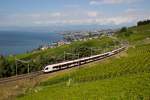 Eng an das steil abfallende Gelände des Lavaux geschmiegt, verläuft das Trasse der  Train des Vignes  Strecke oberhalb von St-Saphorin. Das Bild zeigt den SBB RABe 523 028 als R7 von Palézieux nach Vevey zwischen Chexbres und Vevey bei Kilometer 3.896.