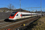 RABe 526 213 Traverso der SOB, durchfährt den Bahnhof Gelterkinden. Die Aufnahme stammt vom 15.02.2021.