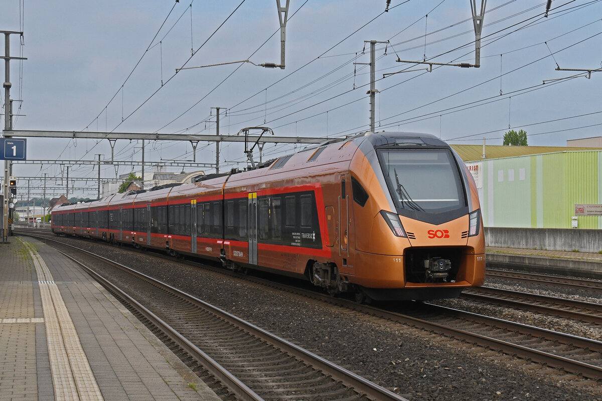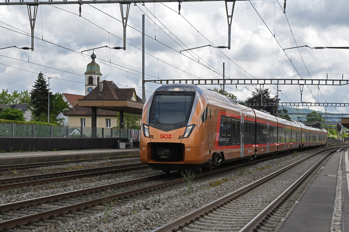 RABe 526 207 Traverso der SOB durchfährt am 12.05.2023 den Bahnhof Rupperswil.