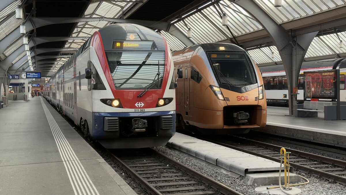Zweimal Stadler am 22.11.2025 in Zürich HB: Für Kiss 063 geht es als IR13 nach St.Gallen, während sich Flirt 221 kurz darauf auf den Weg nach Chur machen wird.