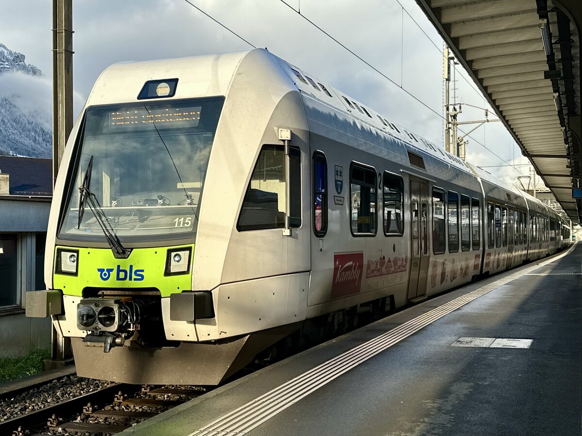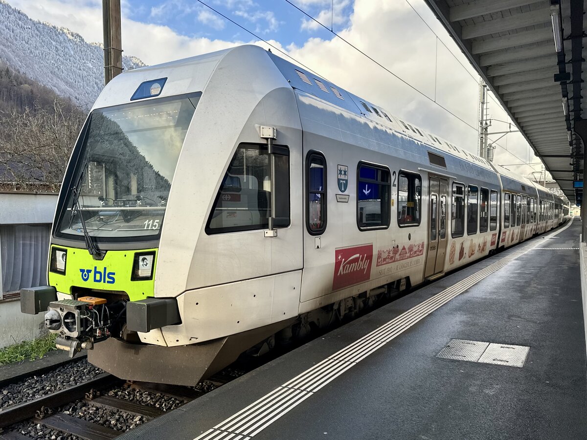 Während sich der andere Kamblyzug RABe 535 114 schon im Refit befindet, dreht der RABe 535 115 "Trubschachen 2" seine letzten Wochen noch, 31.3.26 Interlaken Ost. Stefan H.