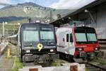 In Martigny wendet der TMR Region Alpes RABe 525 039 für die Rückfahrt nach Le Châble und ein TMR Region Alpes Domino verlässt den Bahnhof in Richtung Brig. 12. September 2024