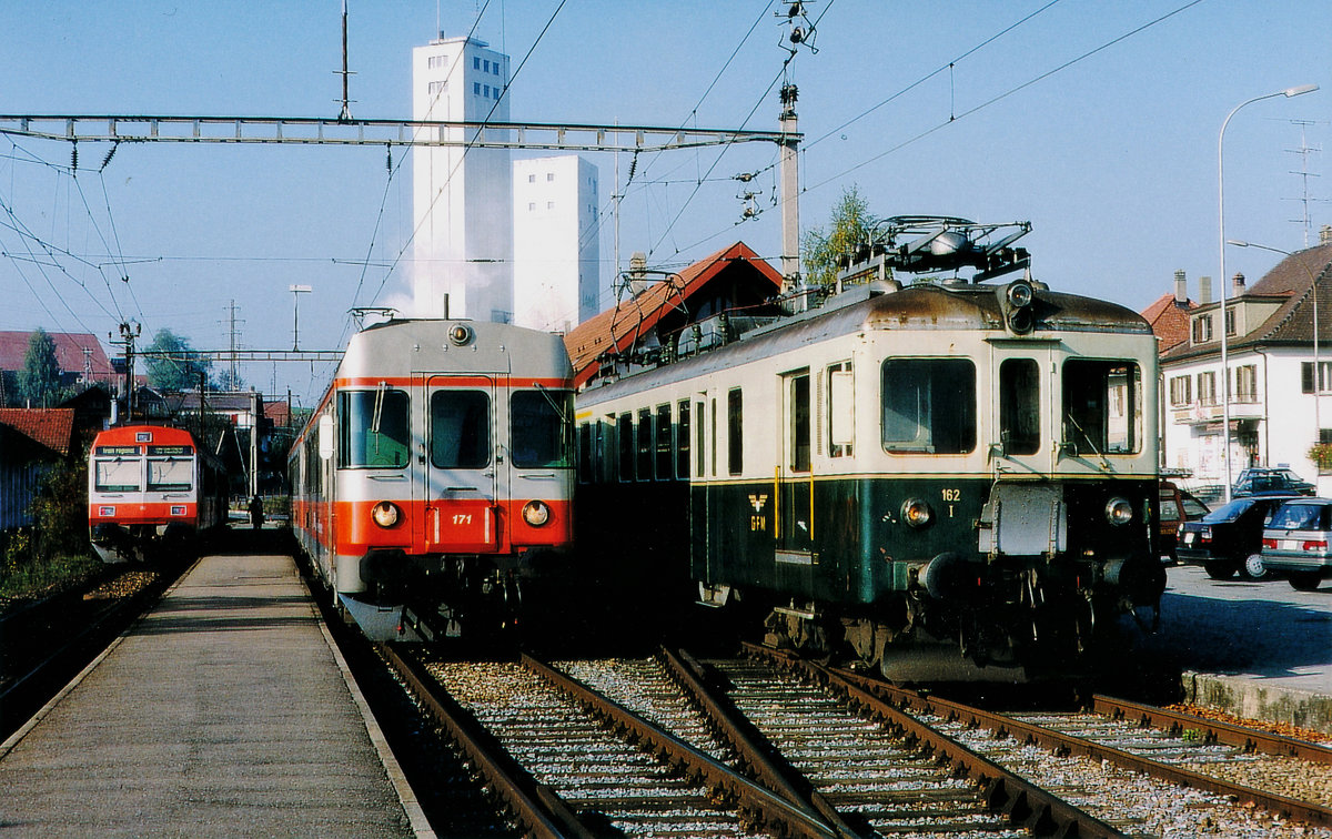 ABDe 4/4 162 (1946), RABDe 4/4 171 (1983) sowie RBDe 537 (1991) in Courtepin vereint im September 1994.
