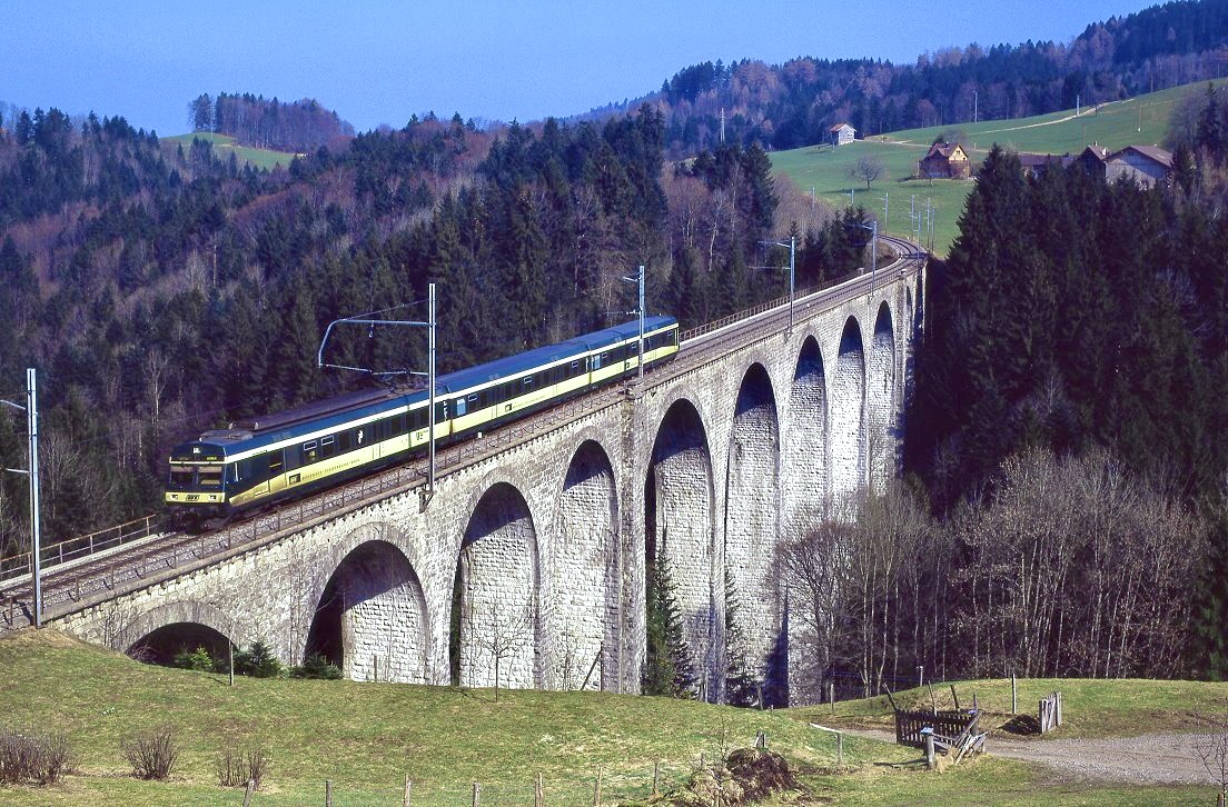 Die S2 15257 (Laupen - Langnau), geschoben vom RBDe 565 742, hat vor kurzer Zeit auf dem Doppelspurabschnitt Konolfingen - Zäziwil den RE Luzern-Bern gekreuzt und fährt nun nach kurzem Halt in Zäziwil auf den Einspurabschnitt Richtung Bowil. 22.2.2010
