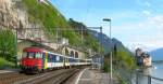 Der „Schüttelbecher“ RBe 540 074 mit dem B 305, A 524 und am Zugschluss der Swiss-Express-Lokomotive Re 4/4 II 11141 (Re 420 141-4) des DSF Koblenz als Extrazug 31415 (Koblenz – Luzern), kurz nach dem Bahnhof Steinerberg aufgenommen | 01.08.2025 S. Achermann