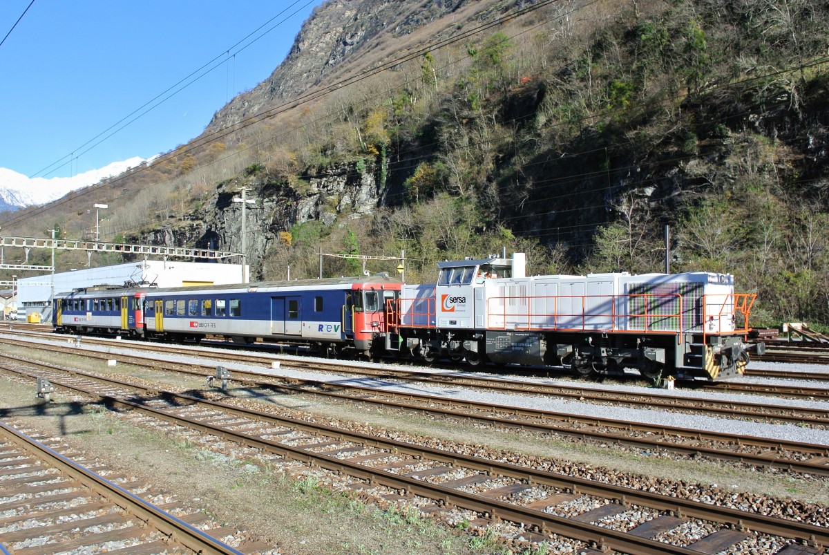 Sersa Diesellok 9280 1275 628-6, SBB BDt EWII 50 85 82-33 931-5 "REV" und SBB RBe 540 055-1 in Biasca TI. Der BDt und der RBe wurden am Morgen von Bern nach Biasca überführt, nun wird die Disellok angehängt. In Kürze schiebt die Sersa Lok dann den Minipendel in den Gotthardbasistunnel, 26.11.2013.