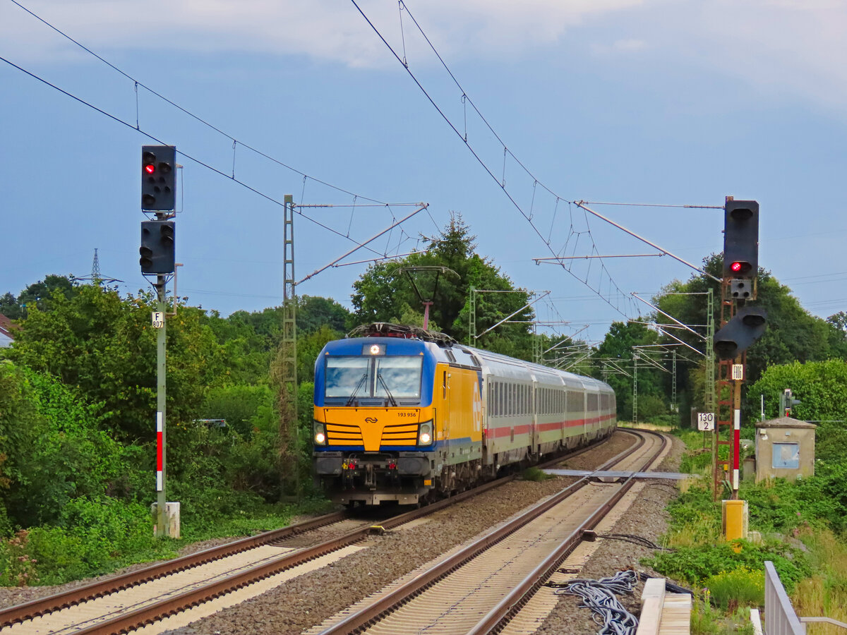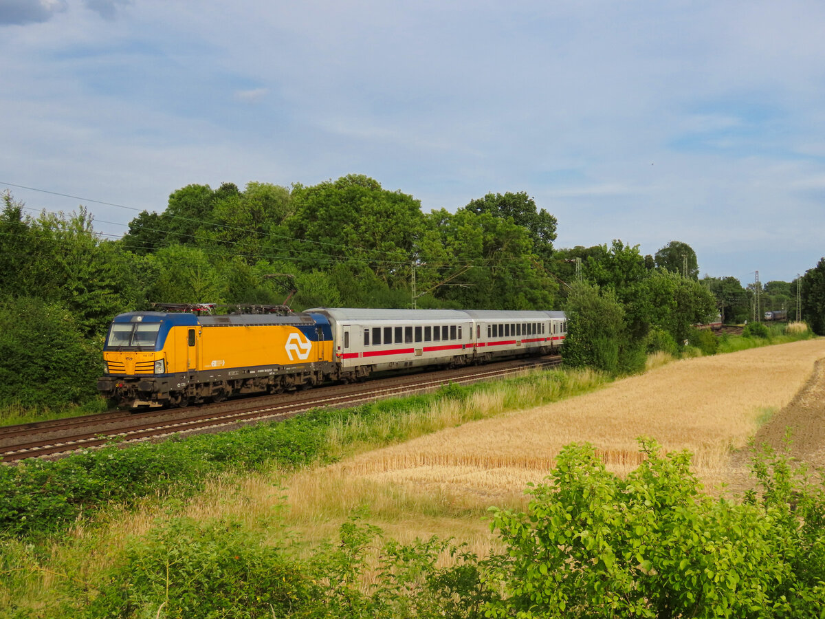 193 759 fährt mit einem Umleiter IC Berlin-Amsterdam über Hannover-Altenbeken-Hamm-Münster-Rheine auf dem letzten Stück der Umleitung durch Greven Richtung Rheine. Juli 2025