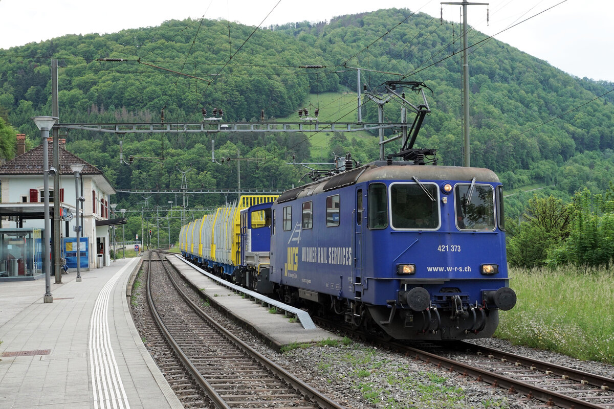 Re 421 373 mit Tm und leeren Holzwagen anlässlich eineim Zwischenhalt in St. Ursanne am 2. Juni 2021.