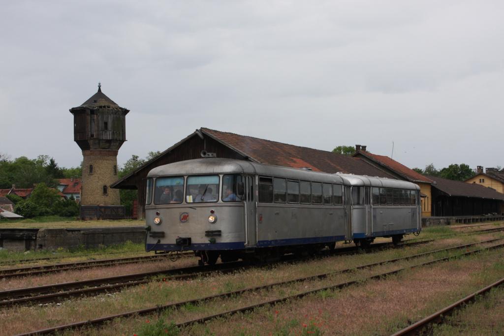 Ein Planzug ist aus Vrbast am 8.5.2010 am Hausbahnsteig des Bahnhof Sombor angekommen. Während dessen gibt es mit einem Schienenbus als Sonderfahrt