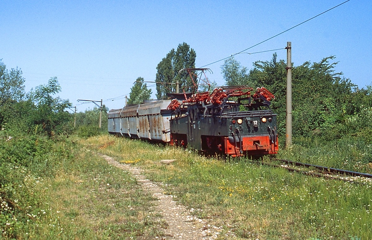Die beiden Grubenlokomotiven 16 und 13 des Kraftwerks Kolubara im Sommer 2005 vor dem Lokschuppen in Vreoci. Die Stromabnehmer an Lok 16 habe ich nicht gezählt (vgl. auch mit Lok 13)!