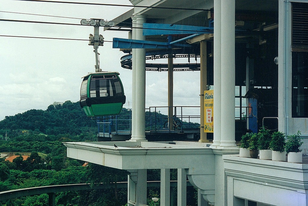 Blick aus der Gondel 42 der Singapore Cable Car MFLG Mount Faber-Linie auf weitere Gondeln, den ersten Stützturm, den Gebäudekomplex in dem sich im 16.Stockwerk die Harbour Front Station befindet, dem Keppel Harbour und die Insel Sentosa. Bild vom 08.Mai 2002. (Fotoscan)