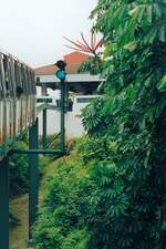 Zug J der SDC Sentosa Monorail hat am 08.Mai 2002 die 2005 geschlossene und 2017 abgerissene Underwater World Station 2 verlassen. (Fotoscan)