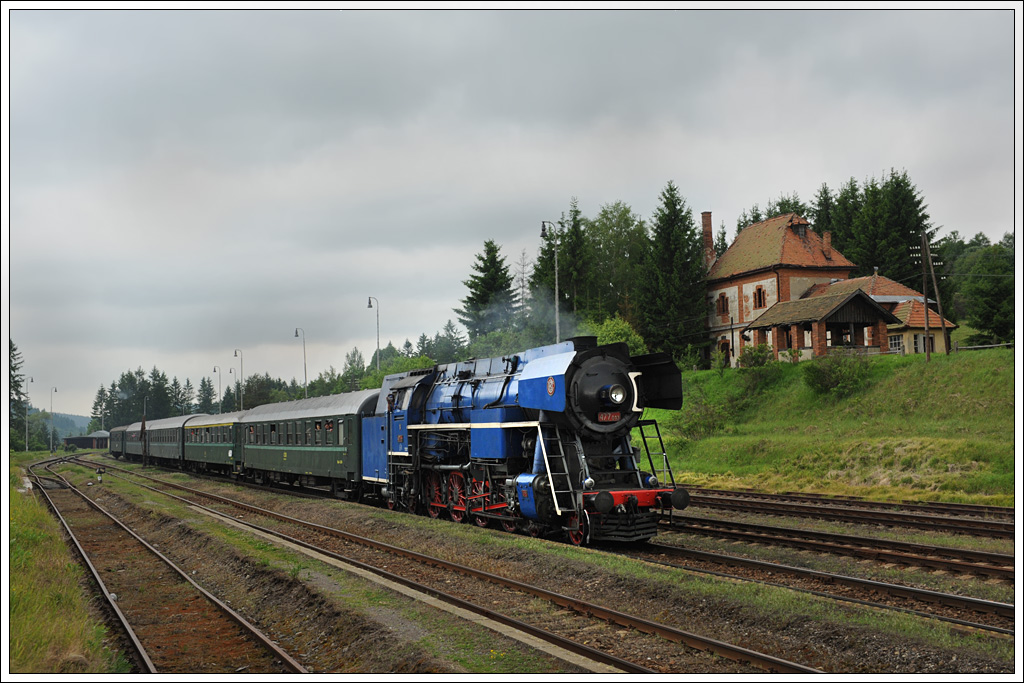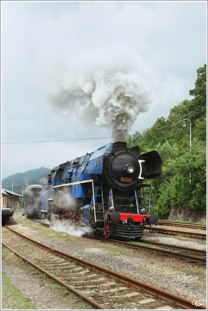 Anlässlich der Kindertage in Vrútky, fährt "Papagei" 477 013 als Os 31217 von Vrútky nach Kremnica, hier bei der Einfahrt in Kremnica.