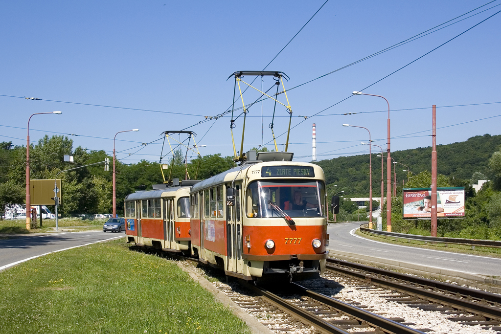 T6A5 7939 + 7940 verlassen als Linie 9 die Endstelle Ruzinov, während das aus den Tw. 7841 + 7842 bestehende T3SUCS - Tandem auf weitere Einsätze wartet. (26.10.2023)