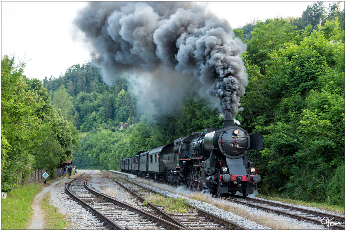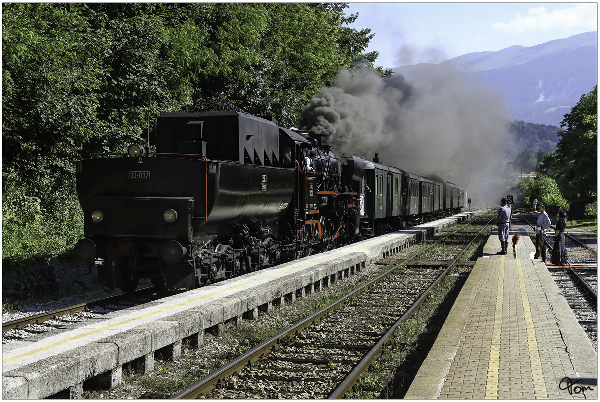 814 109 kreuzt im Bahnhof Bled Jezero, als LP 4292 (Nova Gorica - Jesenice), den von 33 037 gezogenen Dampfsonderzug von Jesenice nach Nova Gorica.