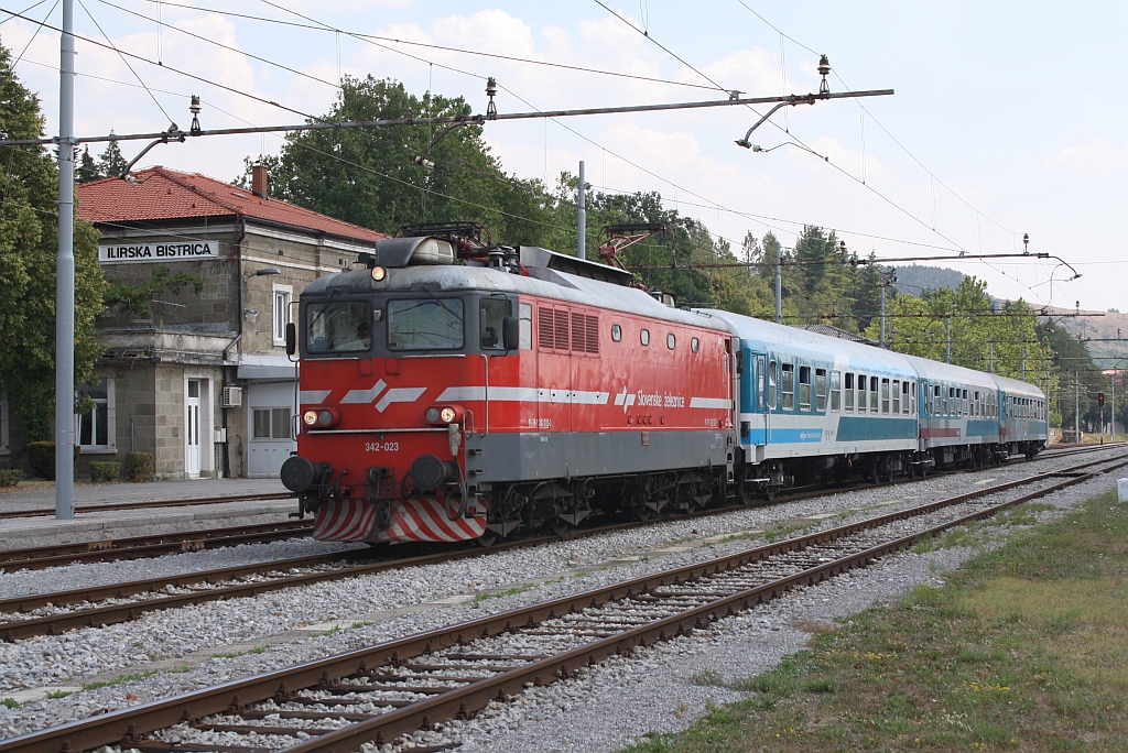 SZ 342-023 mit dem INT 482  Ljubljana  am 18.August 2013 im slowenischem Grenzbahnhof Ilirska Bistrica.
