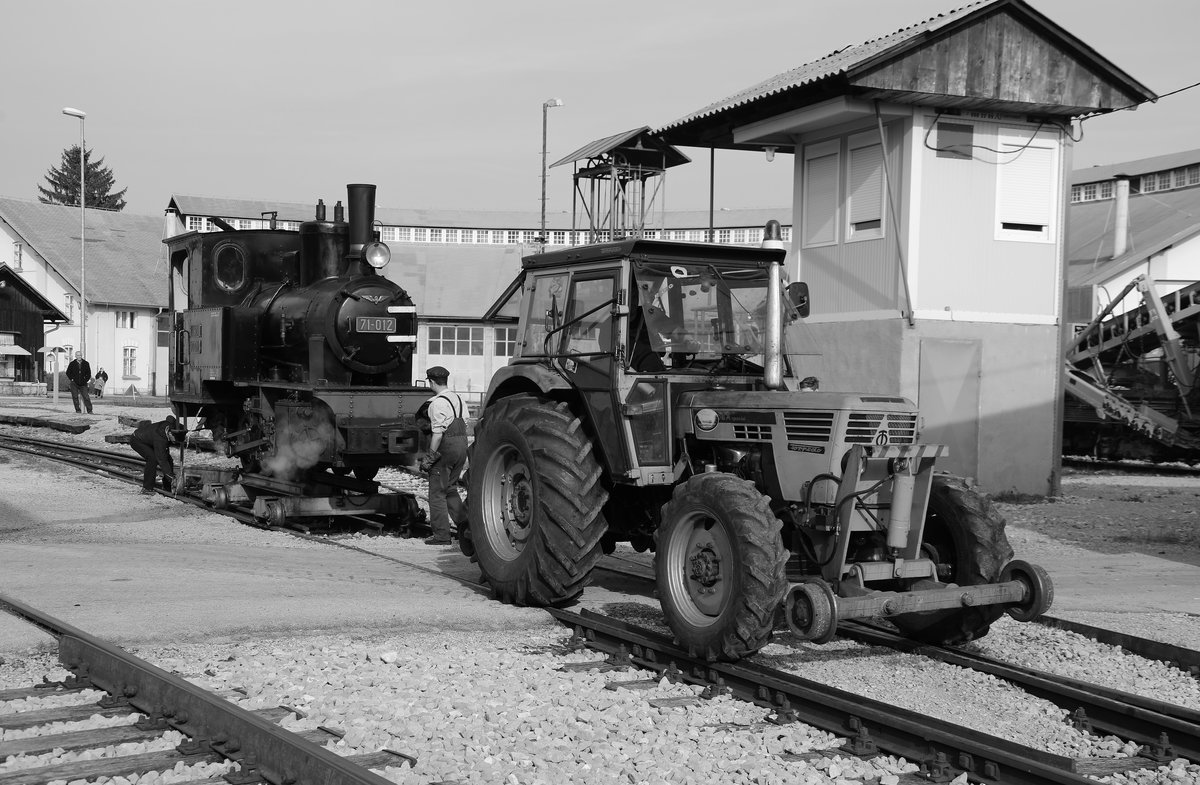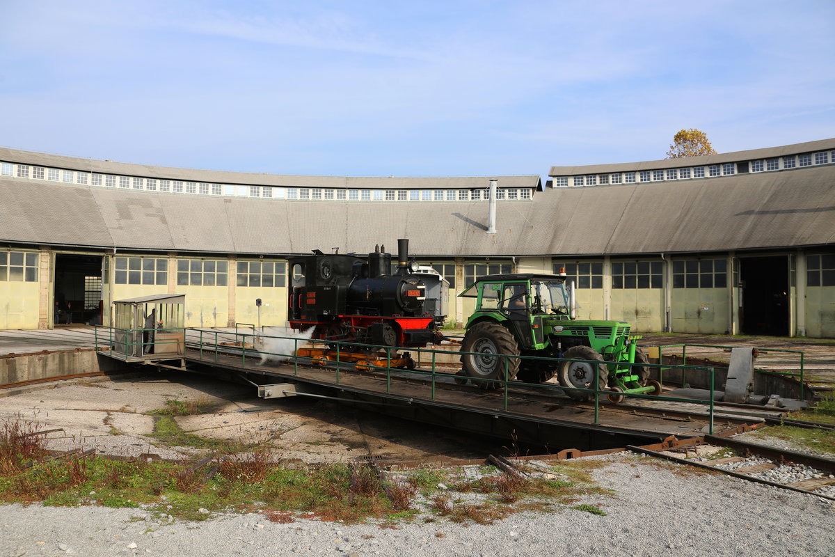 Selbstverständlich nur zum Verschub bewegt sich der 2-Wege Traktor im Bereich des Eisenbahnmuseums.
