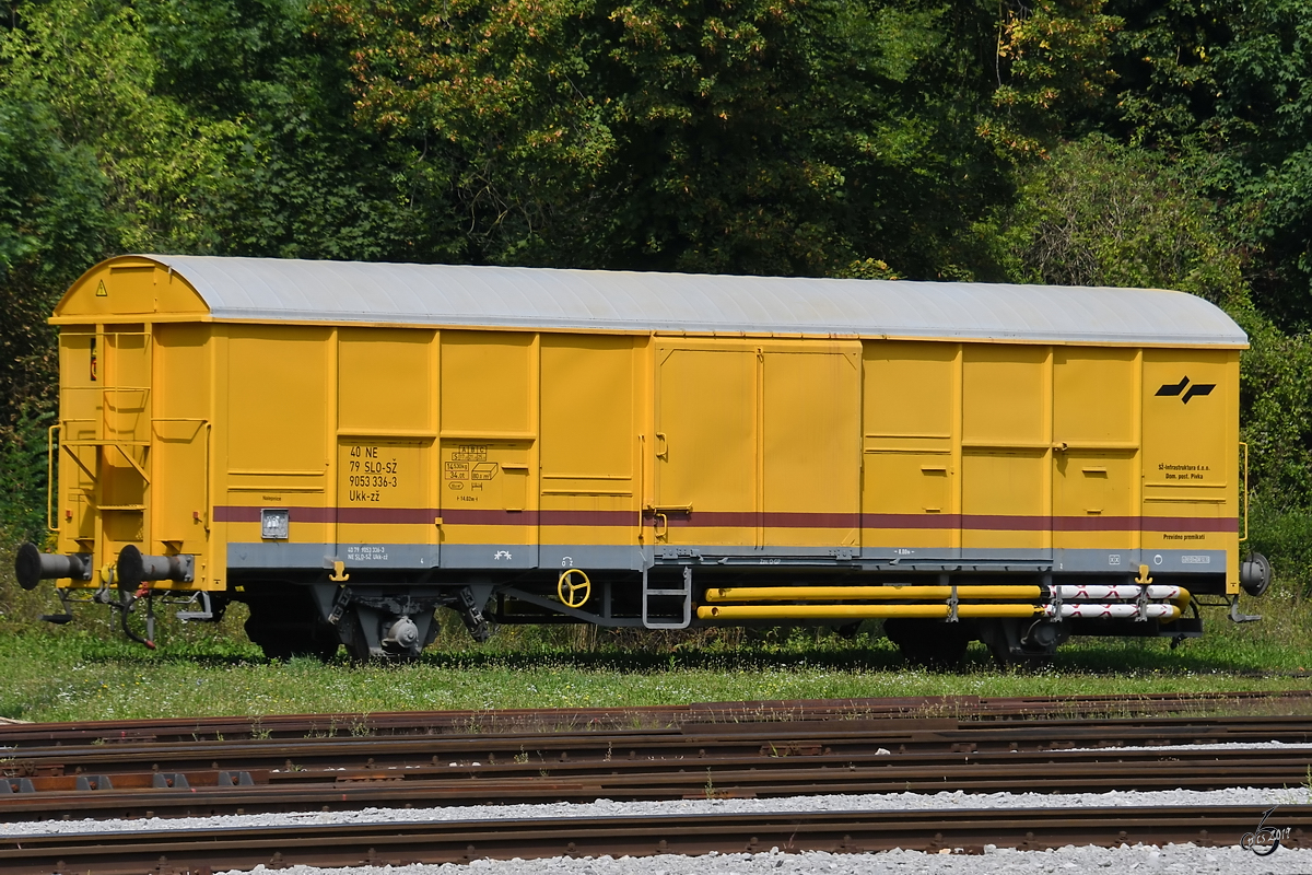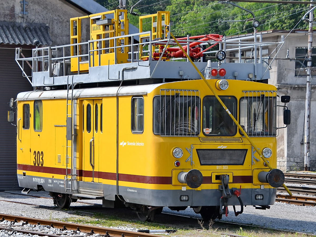 Der Oberleitungs-Revisionswagen 911 303 war Ende August 2019 unweit des Bahnhofes in Pivka zu sehen.