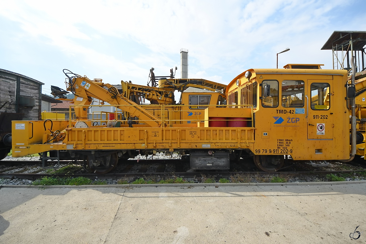 Eine zyklisch arbeitende Zwei- oder Ein-Schwellen-Nivellier-, Hebe-, Richt- und Stopfmaschine Plasser & Theurer Duomatic 08-32 und ein Gleisbaugerät TMD-42 waren Ende August 2019 in Ljubljana zu sehen. Christian Bremer