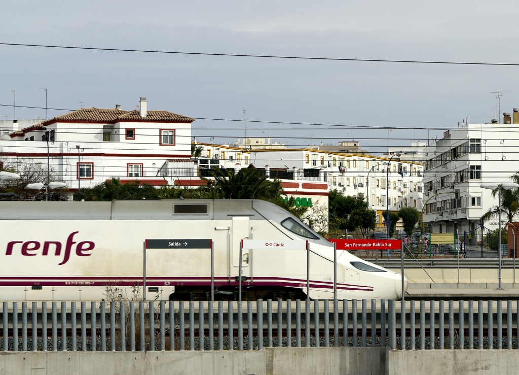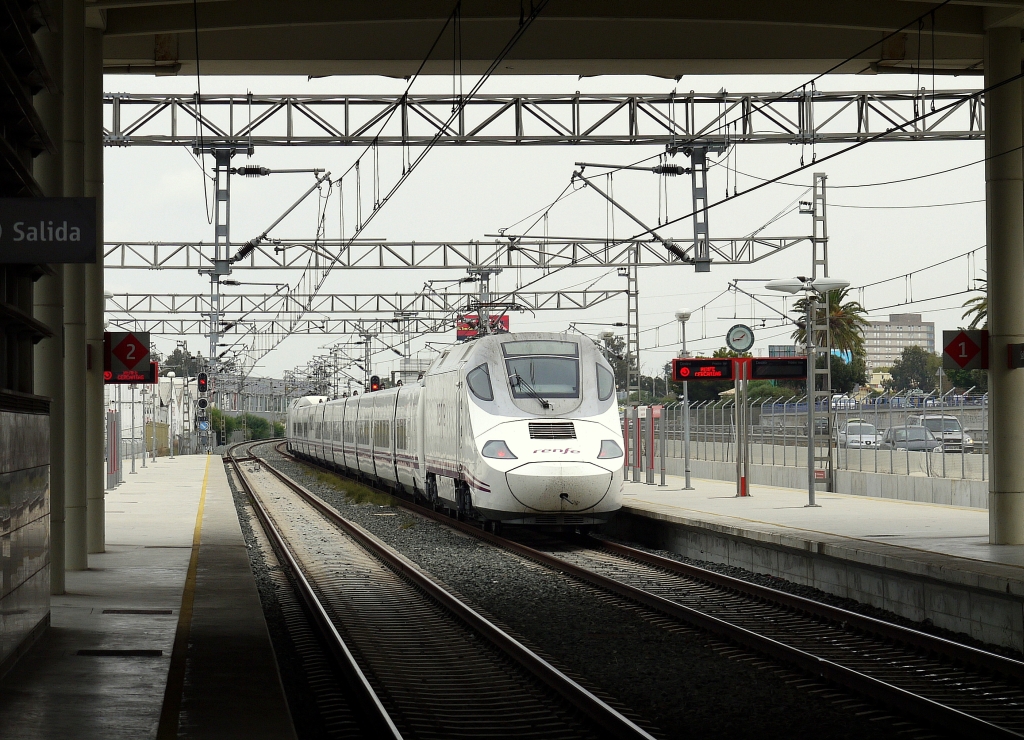 Ausfahrt eines Hochgeschwindigkeitszuges mit Ziel Madrid aus dem Bahnhof "San Fernando Bahia Sur". 18.9.2012