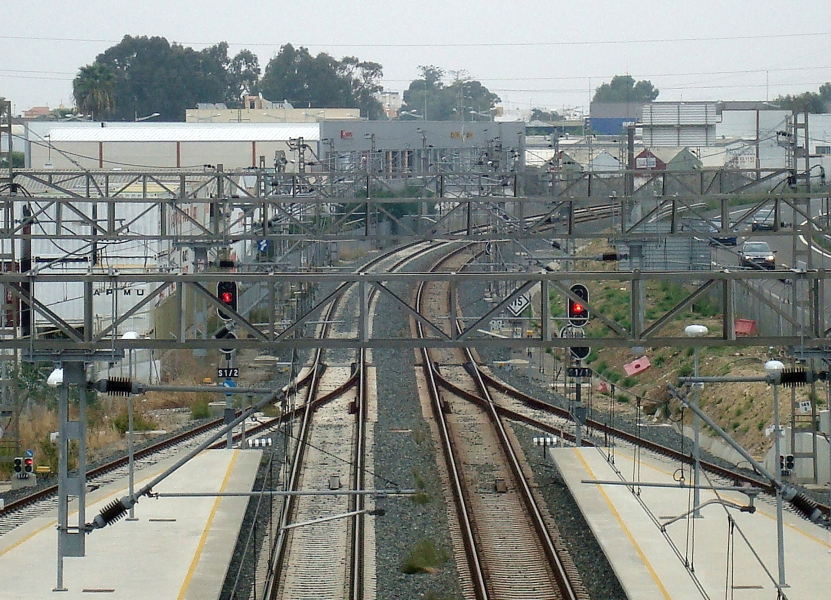 Ein Blick von der Fußgängerbrücke vor dem Empfangsgebäude auf die Streckengleise in Richtung Jerez de la Frontera, der nächsten größeren Stadt. Die Oberleitungskonstruktionen in Spanien sind schon sehr massiv... 23.9.2010