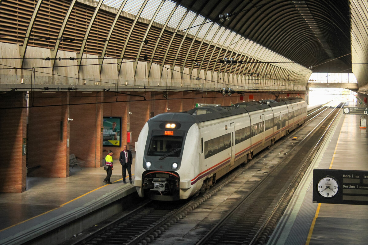 AVE 6 (100 206) der spanischen Staatsbahn Renfe fährt bei 22 Grad und wolkenlosen Himmel in den Bahnhof Sevilla Santa Justa ein. Während solche Temperaturen zu dieser Jahreszeit für einen deutschen Touristen kaum zu glauben sind, ist dies für die Spanier das normalste der Welt. (05.02.2025)