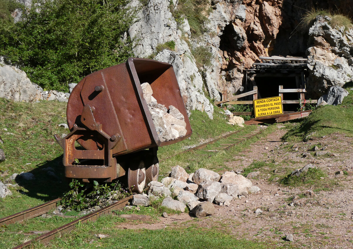 La Mina de Bufferrera: eine ehemalige Minenbahn im Nationalpark Picos de Europa bei den Lagos Covadonga. Sie war bis 1979 in Betrieb und dieses Teilstück zwischen zwei Tunnels direkt an einem Wanderweg ist bis heute erhalten geblieben. Zwei Lorenwagen lockern die Szene auf. Lagos Covadonga, 18.9.2025