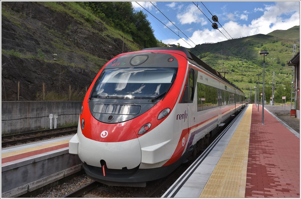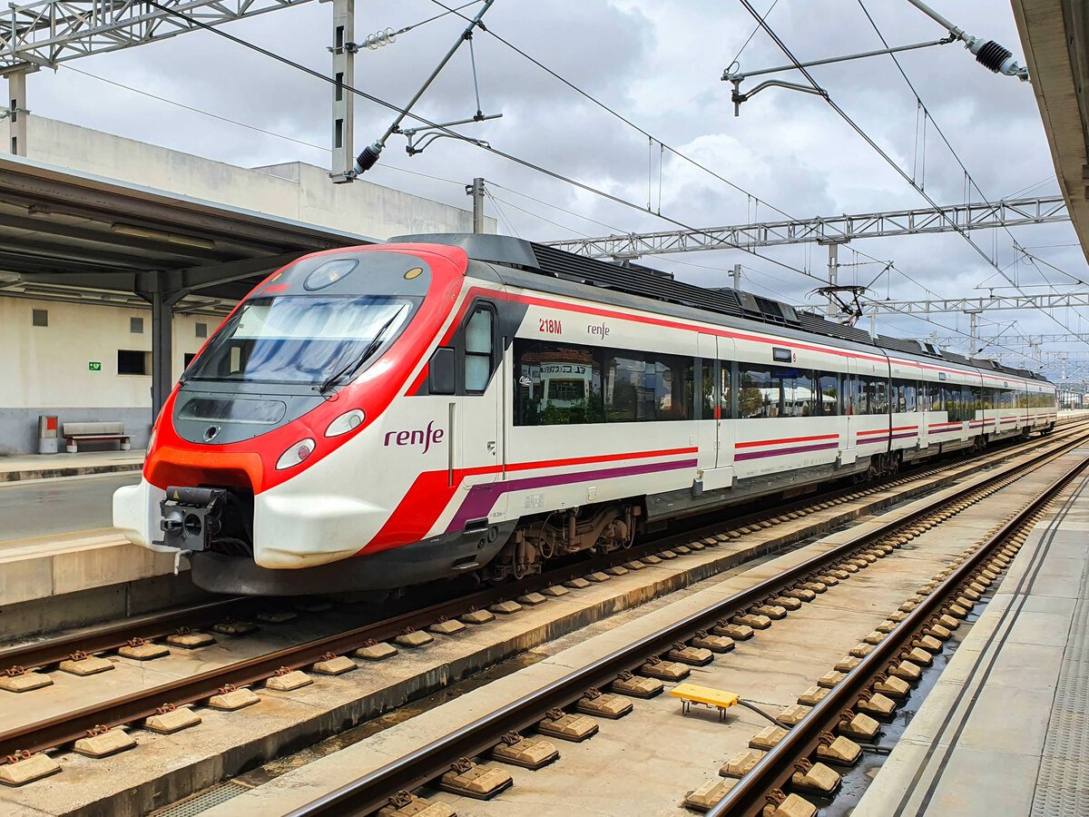 Renfe 211M mit C1 nach Jerez de la Frontera neben einem Alvia nach Madrid in Cadiz, 15.06.2021.