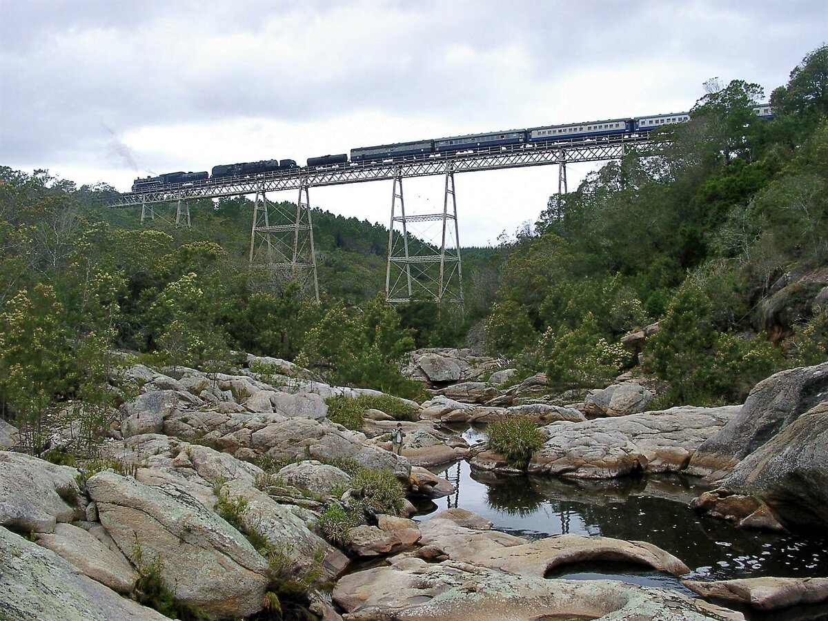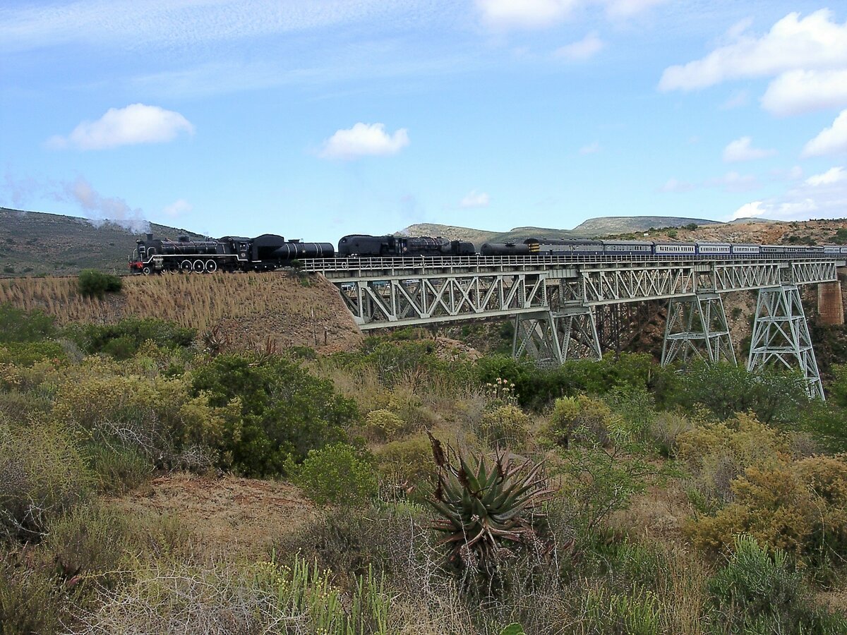 Henschel 15F #2916 mit dem Union Limited am 6.11.2000 zwischen Worchester und Ashton. Der Union Limited war (heute SAR Rail & Steam Tours) eine preisgünstigere Art, Dampfzugreisen anzubieten, die Waggons waren aus den 30er Jahren. Da im Jahr 2000 wegen der großen Trockenheit nur die ölgefeuerte 15F benutzt werden konnte, wurde ab Tag 2-5 alles mit Diesel gefahren.