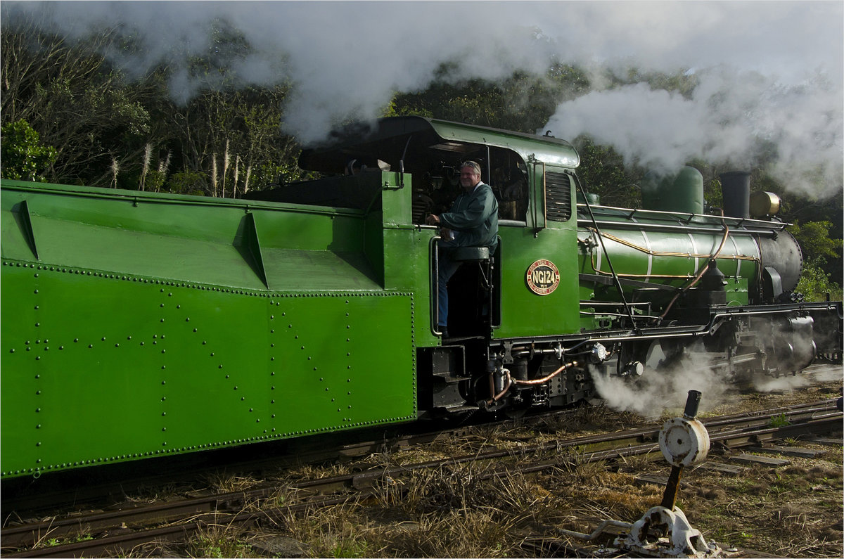 NG15 #124 restored in new apple green (Granny Smith) dashes down the line for a photo shoot in the Humerail yards on 6 Oct 2018