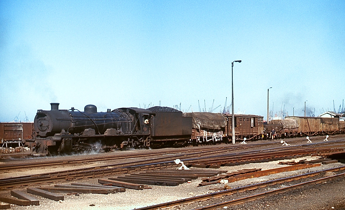 Eine 12AR der SAR (South African Railways) rangiert im November 1976 in Port Elizabeth. Trotz fortschreitender Elektrifizierung und Verdieselung waren Dampflokomotiven an vielen Orten damals noch unentbehrlich.