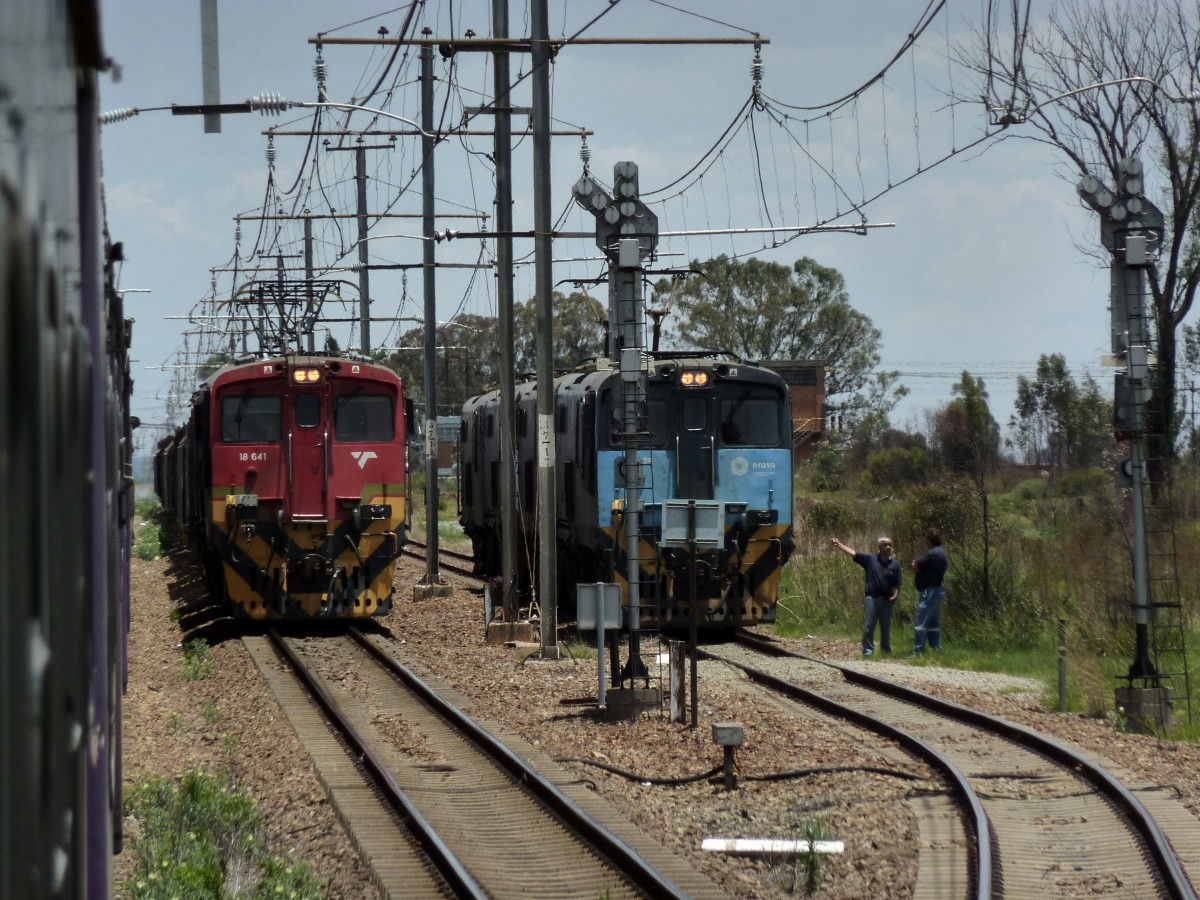 Irgendwo zwischen Klerksdorp und Johannesburg überholt der Shosholoza Meyl einen Güterzug sowie einige Prasa E-Loks. Aufgenommen am 20.11.2014. Matthias Handschuch