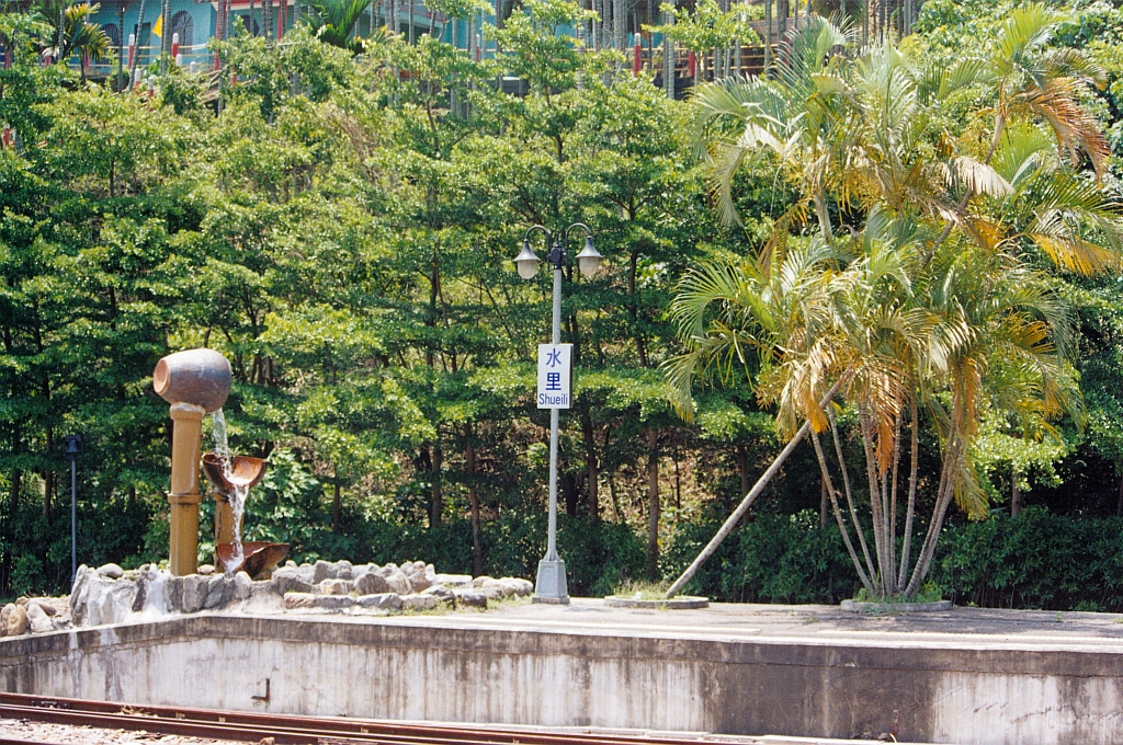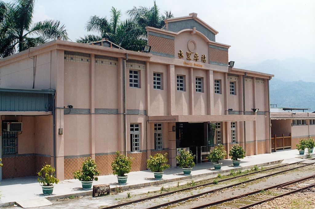 Stilvolle "Beschilderung" am Aufnahmsgebaeude des Bf. Shueili, 22.Mai 2005.