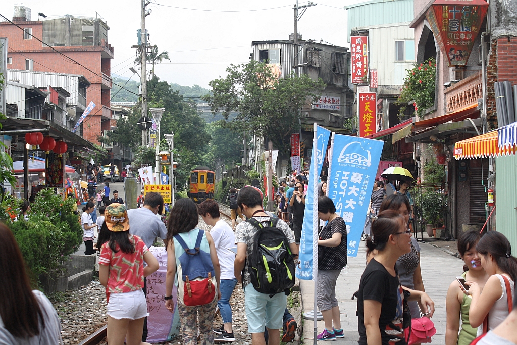 Wenn nicht gerade die stündlichen Zugskreuzungen stattfinden, dann wird das Bahngelände zur öffentlichem Fläche. Blick von der Ortsdurchfahrt in Richtung Shifen Station am 31.Mai 2014.