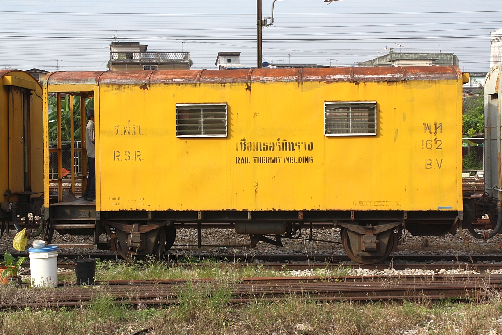 Der พ.ห.113 (พ.ห.=B.V./Brake Van, Fuji Car Mfg.Co.Ltd./Japan, Bauj. 1956) wurde umgebaut und ist heute der Schienenschweißtruppe zugeordnet. Bf. Surat Thani am 07.Jänner 2013.