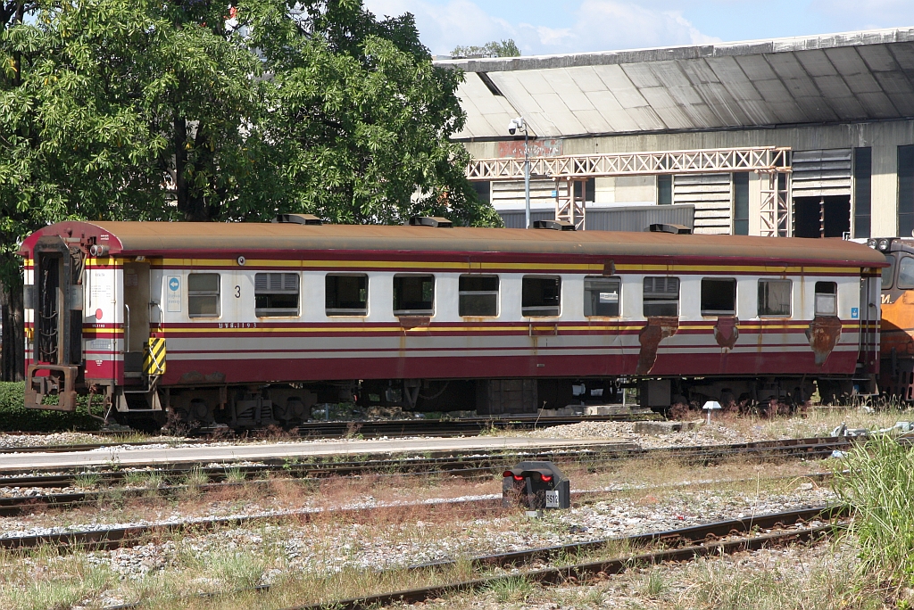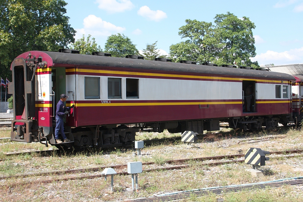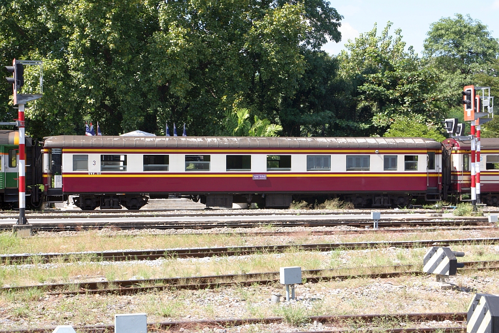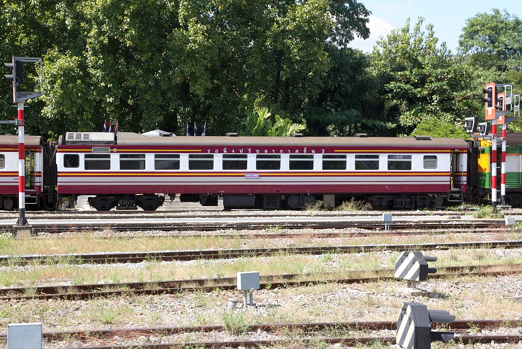 Aktuell werden von den SRT 130 Wagen der Gattung บชส. (บชส. =BTC./Bogie Third Class Carriage) mit Aircondition ausgerüstet und dann als Gattung บชส.ป (บชส.ป=ATC/Air-Conditioned Third Class Carriage) bezeichnet. - Das Bild vom 06.Dezember 2025 zeigt den บชส.ป 4 in der Hua Lamphong Station. Karl Seltenhammer
