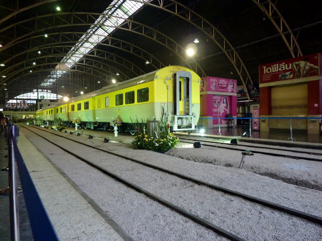 Der vermutlich sauberste Zug der Welt, der Zug von König Bhumibol stand vor seinem Geburtstag mehrere Tage lang im Bahnhof Hualamphong ausgestellt, von Scheinwerfern beleuchtet und mit Blumen geschmückt. Aufgenommen am 03.12.2012.