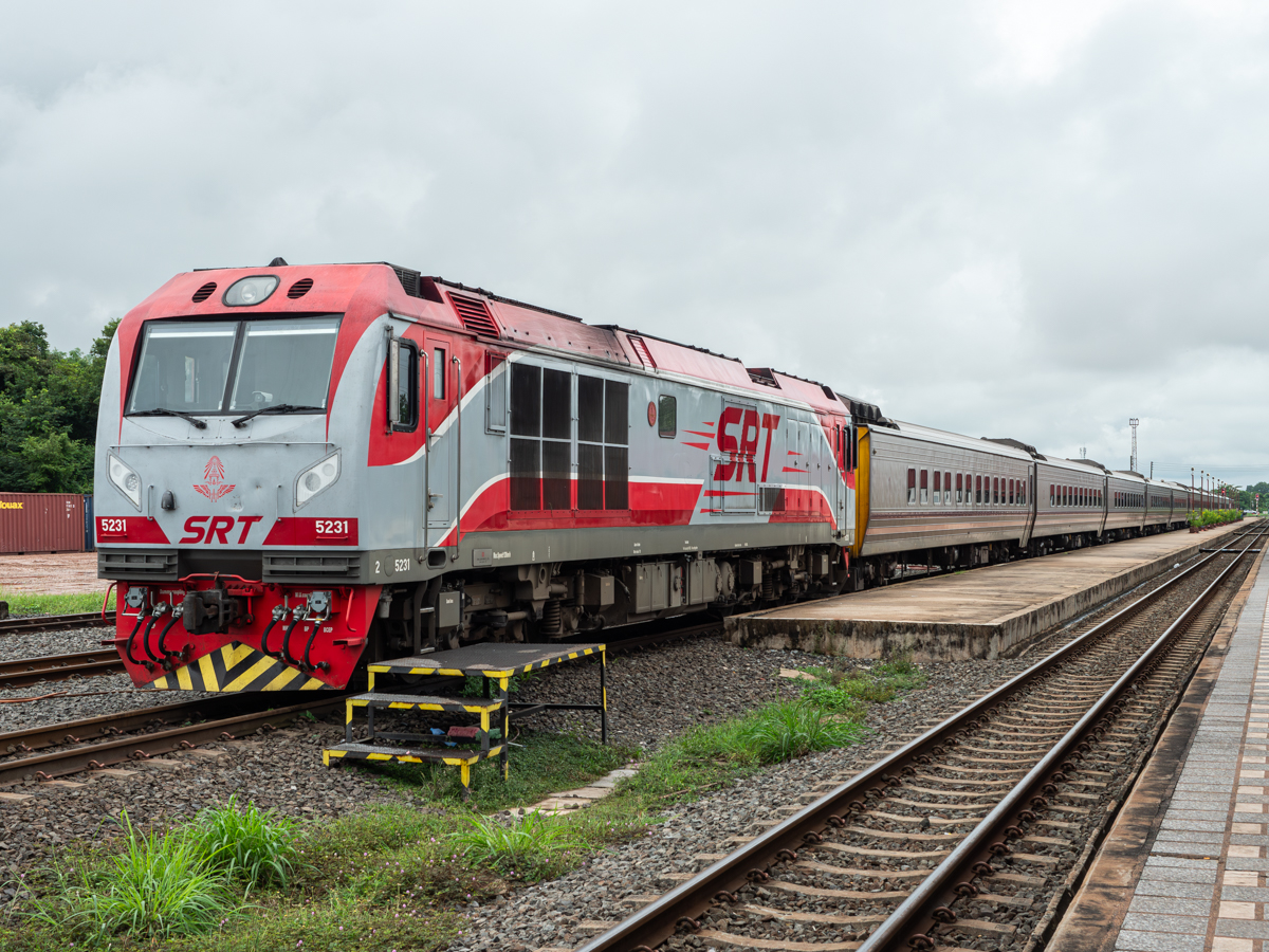 09.12.2013: Der Shuttle-Zug von Nong Khai (Thailand) über die Freundschaftsbrücke nach Thanaleng (Laos) steht zur Abfahrt bereit. Es handelt sich um den zweiteiligen DMU 1022, Typ RHN von Hitachi, Baujahr 1967. Dieser ist eine Dauerleihgabe der SRT (State Railways of Thailand) an Laos.