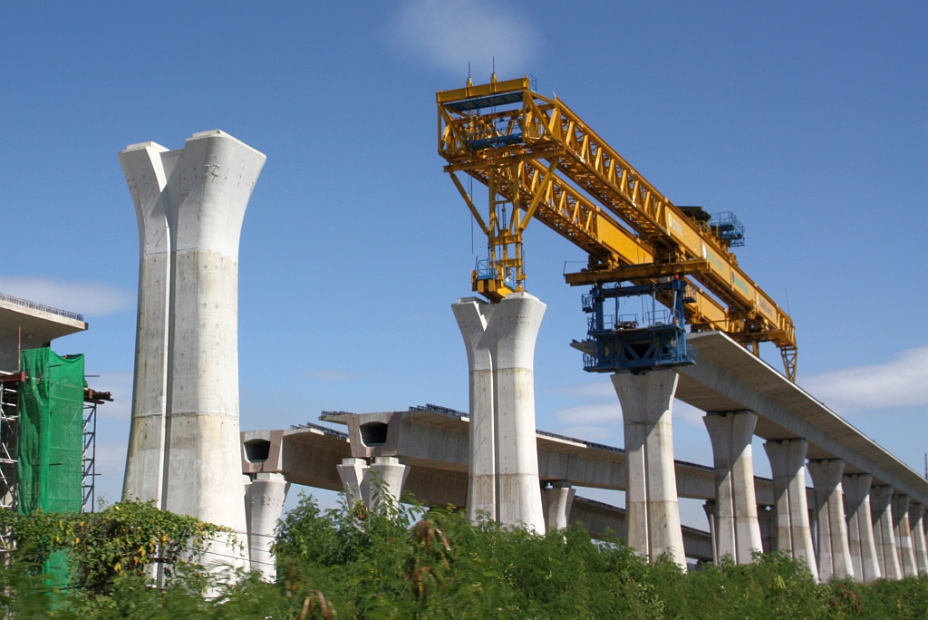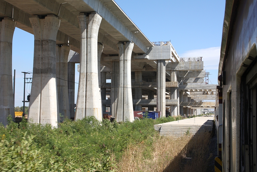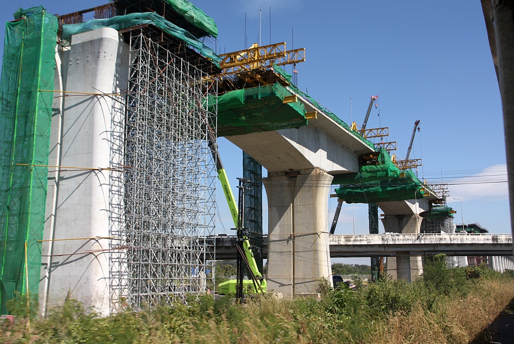 Muak Lek Station am 03.Dezember 2025: rechts das 48m hohe und 4,8Km lange SRT Muak Lek Viadukt, in der Mitte die Trasse der SRT Northeastern Line und links die in Bau befindliche SRTET HSR Northeastern Line.