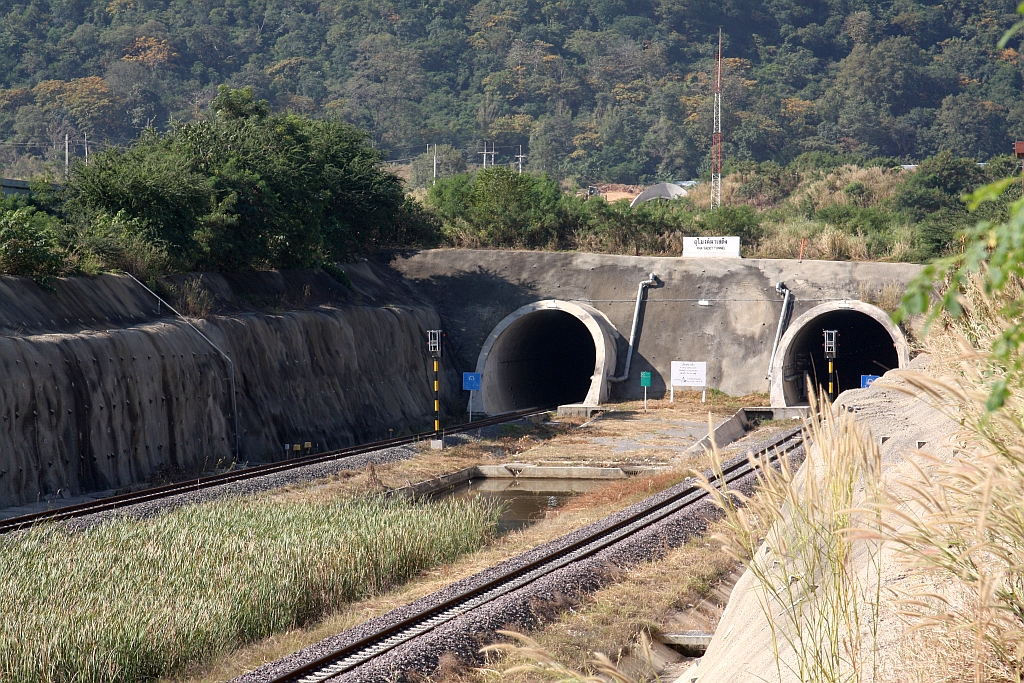Auf der am 28. Juli 2024 in Betrieb genommenen 13,2 Kilometer langen Neubaustrecke zwischen Mab Kabao und Muak Lek befindet sich der Pha Sadet Tunnel, mit einer Länge von 5408,69 Meter der nun längste Eisenbahntunnel in Thailand. - Im Bild vom 03.Dezember 2025 die Nordportale des zweiröhrigen Tunnels. - Links des Sendemastes erkennt man das Nordportal des Muak Lek Tunnel 2 der in Bau befindlichen SRTET HSR Northeastern Line.