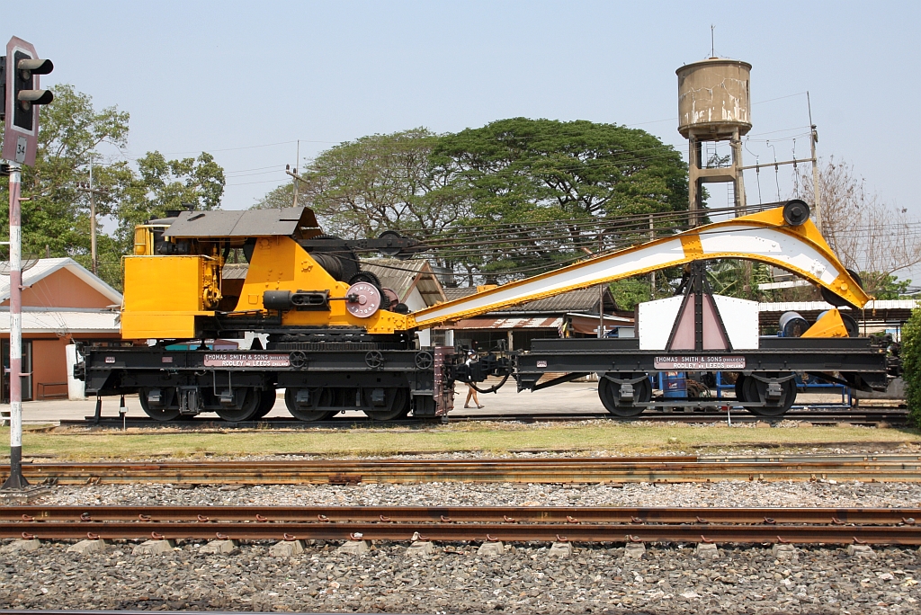 บปก. 24 (บปก. = B.L.C./Bogie Locomotive Crane, Thomas Smith & Sons - England, Bauj. 1929, Fab.Nr. 11207) mit ต.ก. 24 (ต.ก. = C.R./Crane Runner, Thomas Smith & Sons - England, Bauj. 1929, Fab.Nr. 112??) als Denkmal aufgestellt im Depot Pak Nam Pho. Bild vom 29.März 2023.