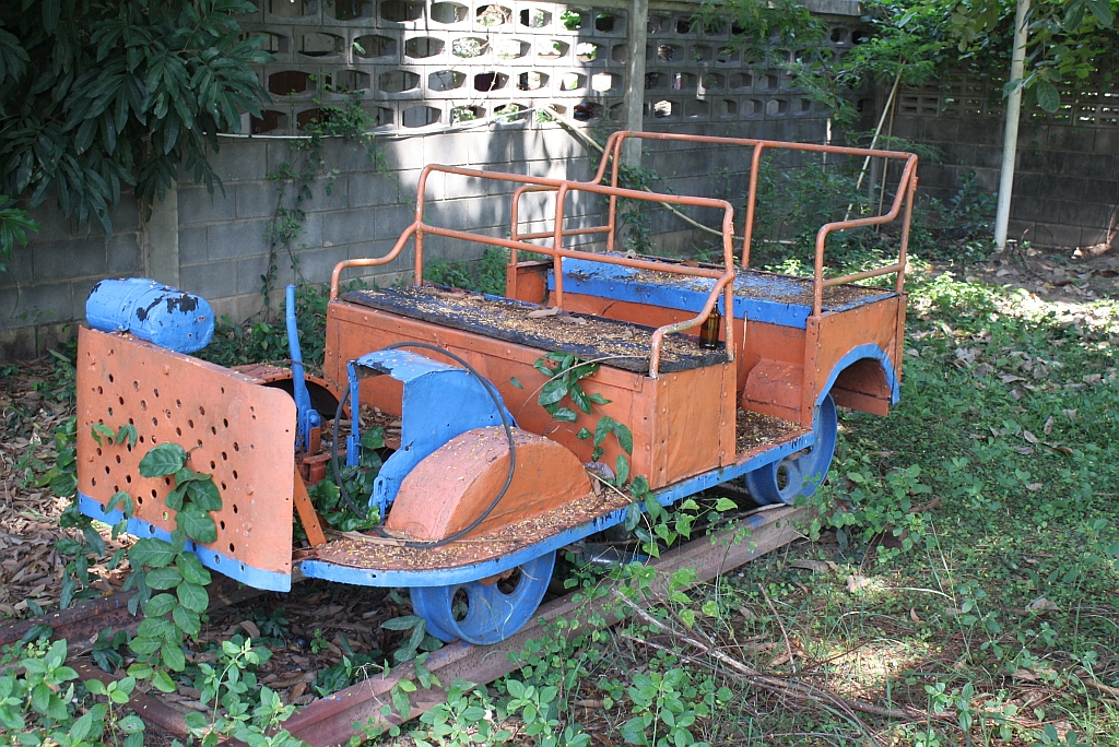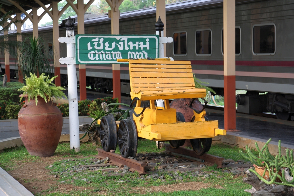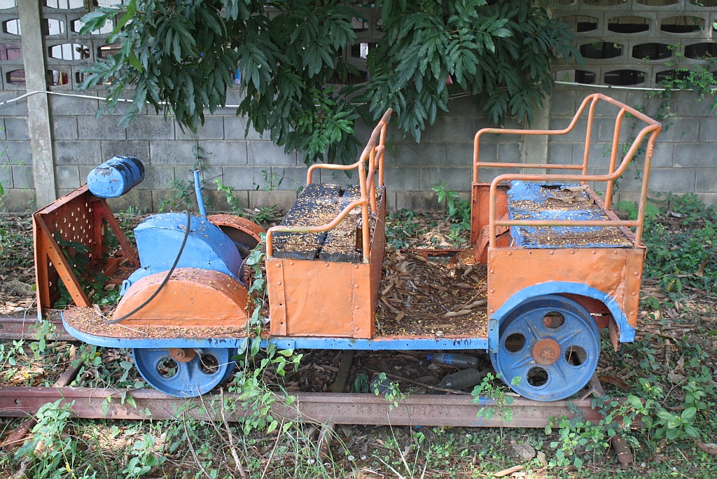 Neben dem westlichsten Bahnsteiggleis in der Chiang Mai Station ist diese Handhebeldraisine mit Fahrgastbank als Schaustück aufgestellt. Aufnahme vom 06.Jänner 2011.