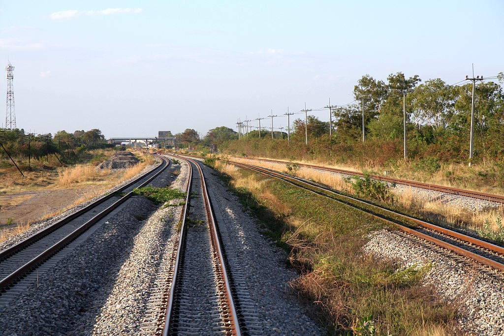 Im Rahmen des aktuellen Modernisierungsprogram der SRT wurde beim zweigleisigen Ausbau Lop Buri - Pak Nam Pho auch die Khok Kathiam Station neu errichtet und in Khok Kathiam Junction umbenannt und am 05.Dezember 2025 die neu errichtete Umfahrung Lop Buri in Betrieb genommen. - Im Bild vom 27.Februar 2026 die neuen Gleise der Umfahrung und rechts das Gleis der alten Northern Line.