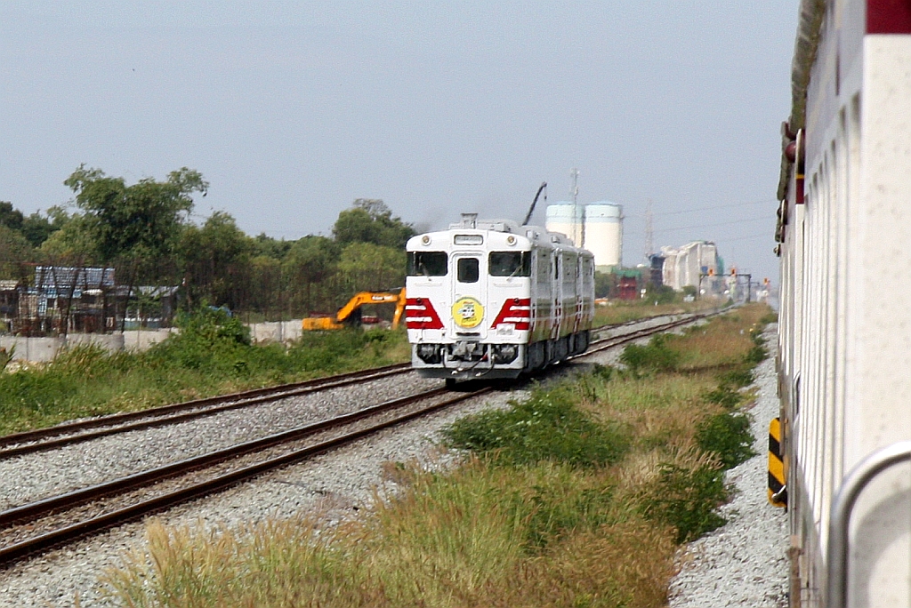 Von den JR East erhielten die SRT 9 KIHA 40 und 11 KIHA 48 welche per Schiff am 02.Juni 2024 in Thailand ankamen. - Die Fahrzeuge werden im Makkasan Workshop an die SRT Bedingungen angepasst und sollen als "Bangkok Commuter Train" eingesetzt werden. - Zusätzlich zur neuen SRT-Fahrzeugnummer behalten die Fahrzeuge ihre alte JR East-Fahrzeugnummer. - Im Bild vom 04.Dezember 2025 die SRT APD. 704 (ex JR East KIHA 40-532), SRT APD. 802 (ex JR East 48-516) und SRT APD. 701 (ex JR East 40-521) als Experiment 1181 (Makkasan - Ayutthaya) beim Strecken-Km 42 der Northern Line.