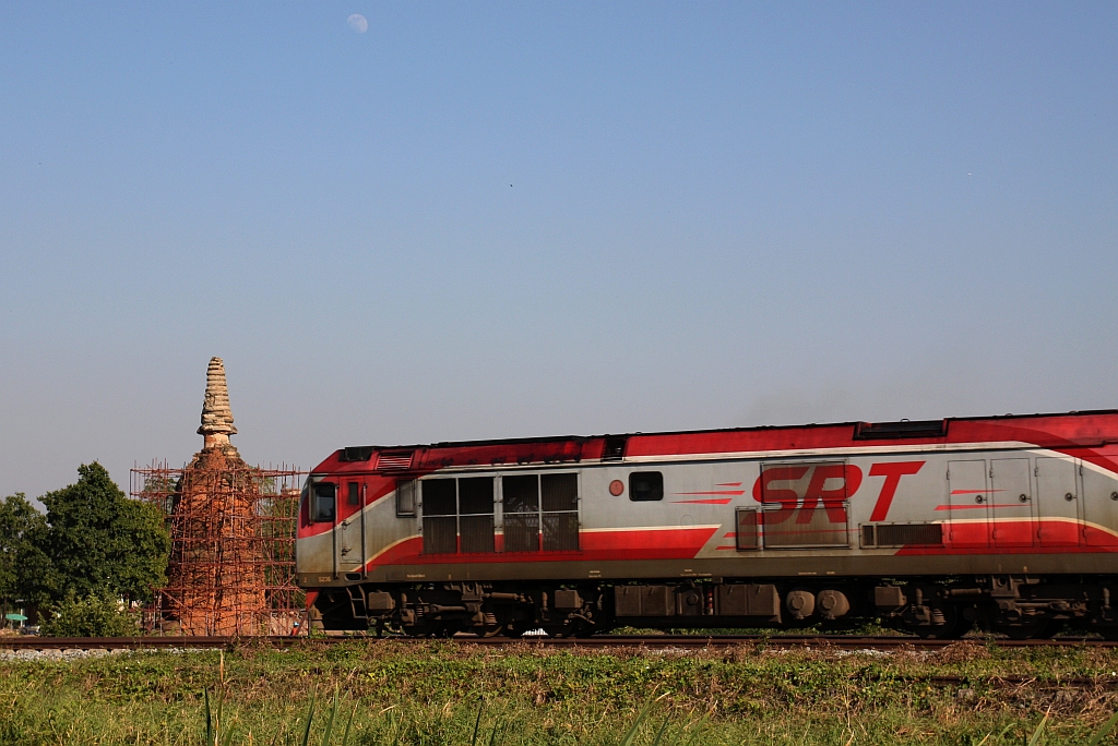 Postkarten-Klischee 1: QSY 5236 (Co'Co', de, CRRC Qishuyan) mit historischer Stupa und Mond am 01.Dezember 2025 in Ayutthaya.