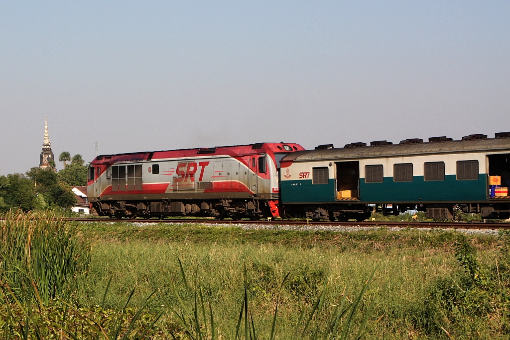 Postkarten-Klischee 2: QSY 5236 (Co'Co', de, CRRC Qishuyan) mit dem Rap 109 (Krung Thep Aphiwat - Chiang Mai) vor historischer Stupa am 01.Dezember 2025 in Ayutthaya.