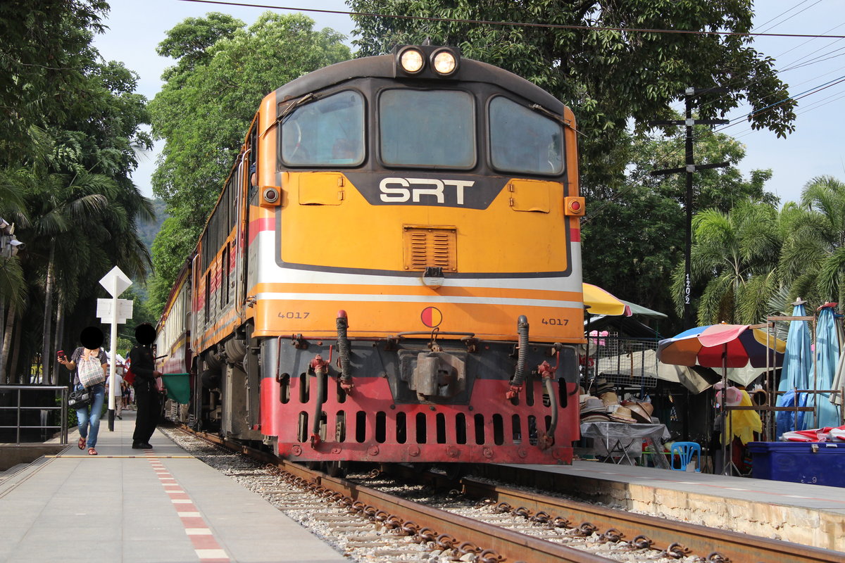 Überascht von der Drainsine: SRT Draisine durchfährt den Bahnhof Saphan Kwai Yai. Sie wird dann vor dem Bahnübergang, der gerade in der Nähe liegt, von das Personal hinausgeschleppt.