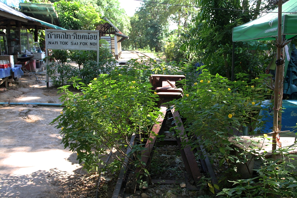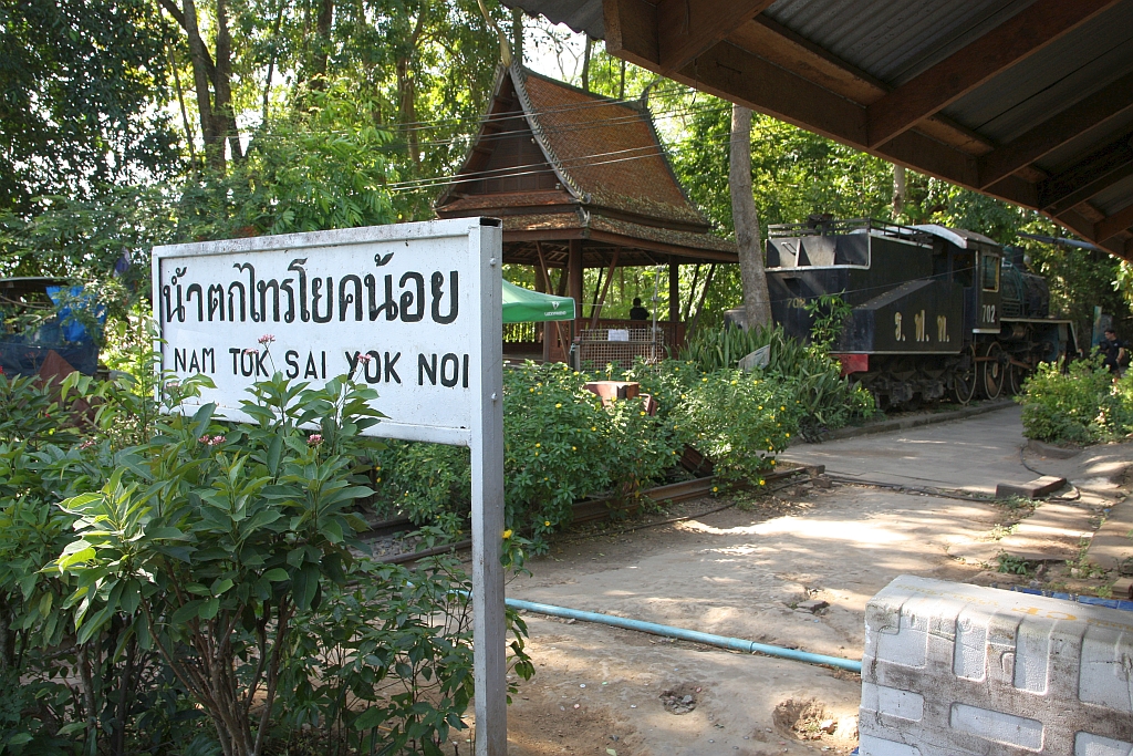 Stationsschild und zugewachsener Gleisabschluss der Nam Tok Sai Yok Noi Station am 28.November 2025; im Hintergrund die SRT 702 (ex JNR C56.04, 1'C-h2, Mitsubishi, Bauj. 1935, Fab.Nr. 156). - Diese Station ist das jetzige Ende der Thailand-Burma Railway (Death Railway) auf thailändischer Seite und wird nur mehr von Excursionzügen angefahren.