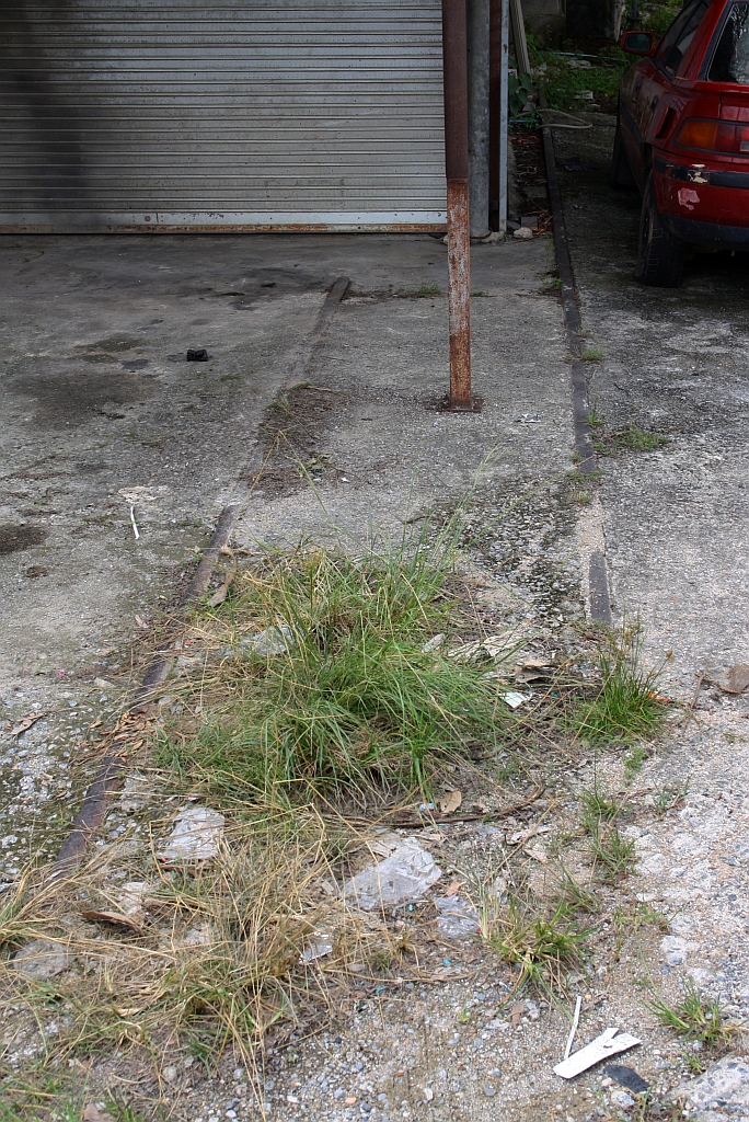 Von der 1978 eingestellten Bahnlinie Hat Yai Junction - Songkhla existieren noch einige Relikte. - Ungefähr beim Strecken-Km 937,60 sind noch die Gleise vorhanden. - Bild vom 16.Mai 2025.